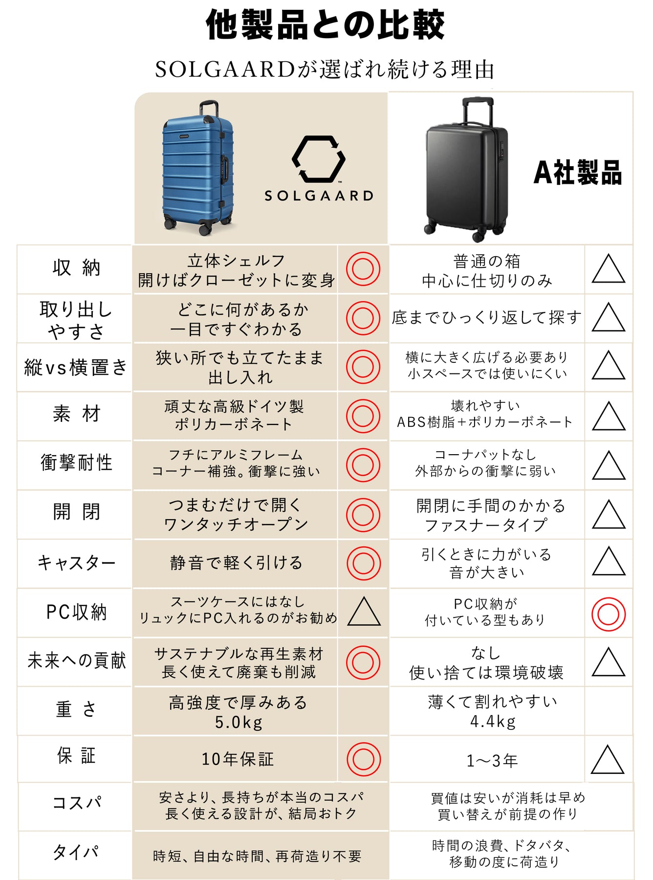 ほぼ全ての会社は機内預け入れ時の破損は保証対象外となっていますが、SOLGAARDでは預け入れ時の破損も保証適応いたします。ここまで手厚く保証があるところは非常に稀です。